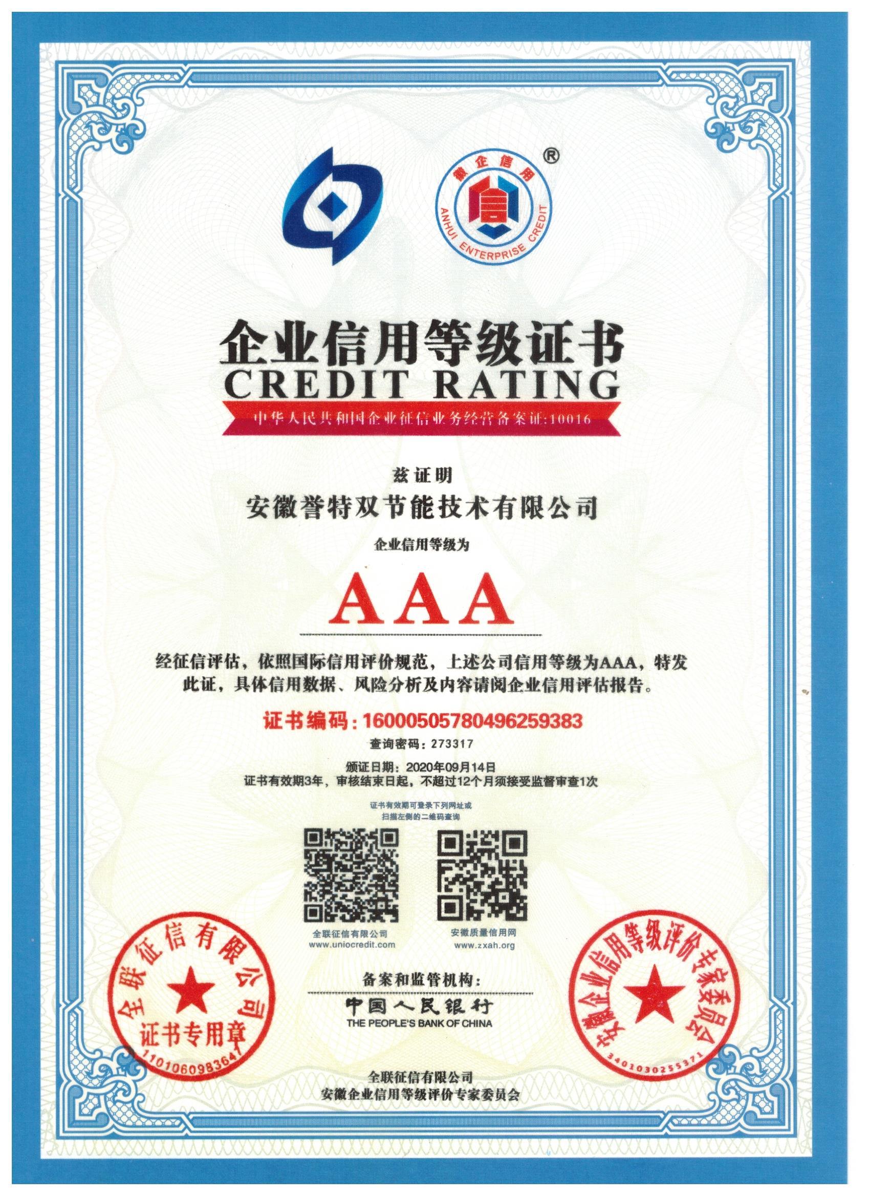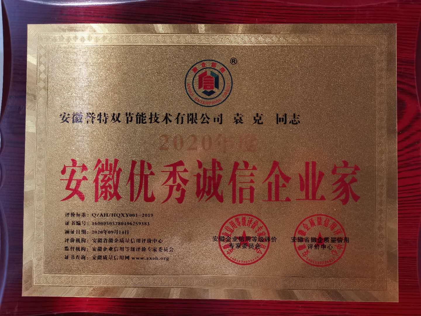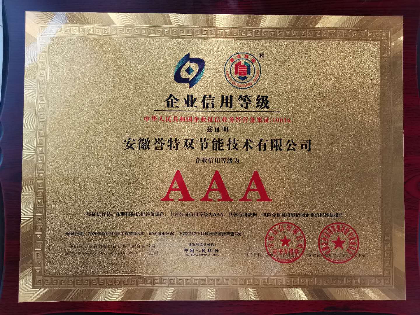 此次公司入選“安徽AAA級信用企業”,總經理袁克同志獲評2020年度“安徽省優秀誠信企業家”,榮譽稱號,即是榮耀,更是鞭策,公司將不斷提高企業信用建設,發揮企業信譽優勢,為國家節能環保事業做出更大的貢獻!