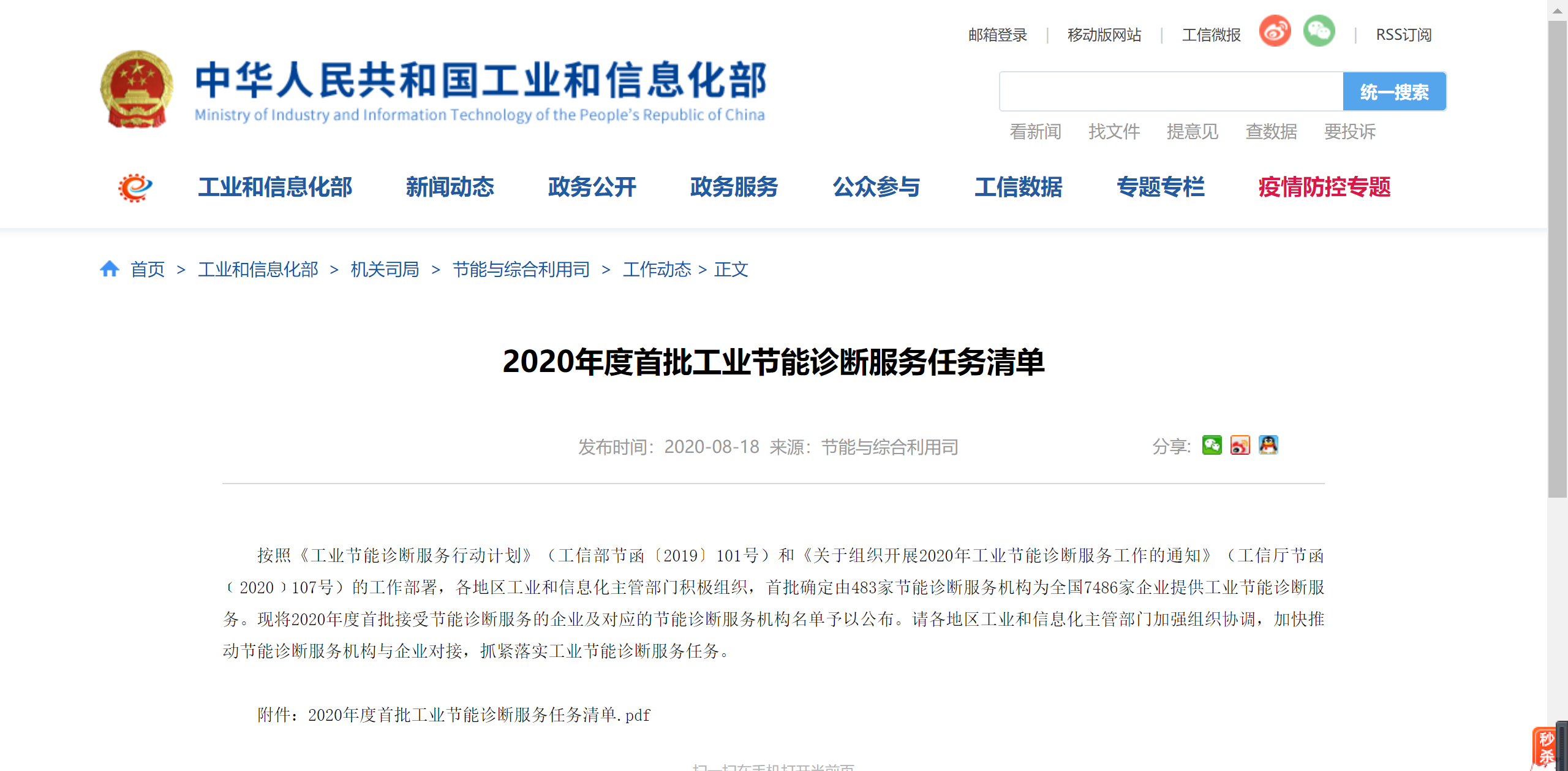 2020年7月,我公司中標工業和信息化部節能與綜合利用司——2020年度節能診斷服務機構選聘項目。