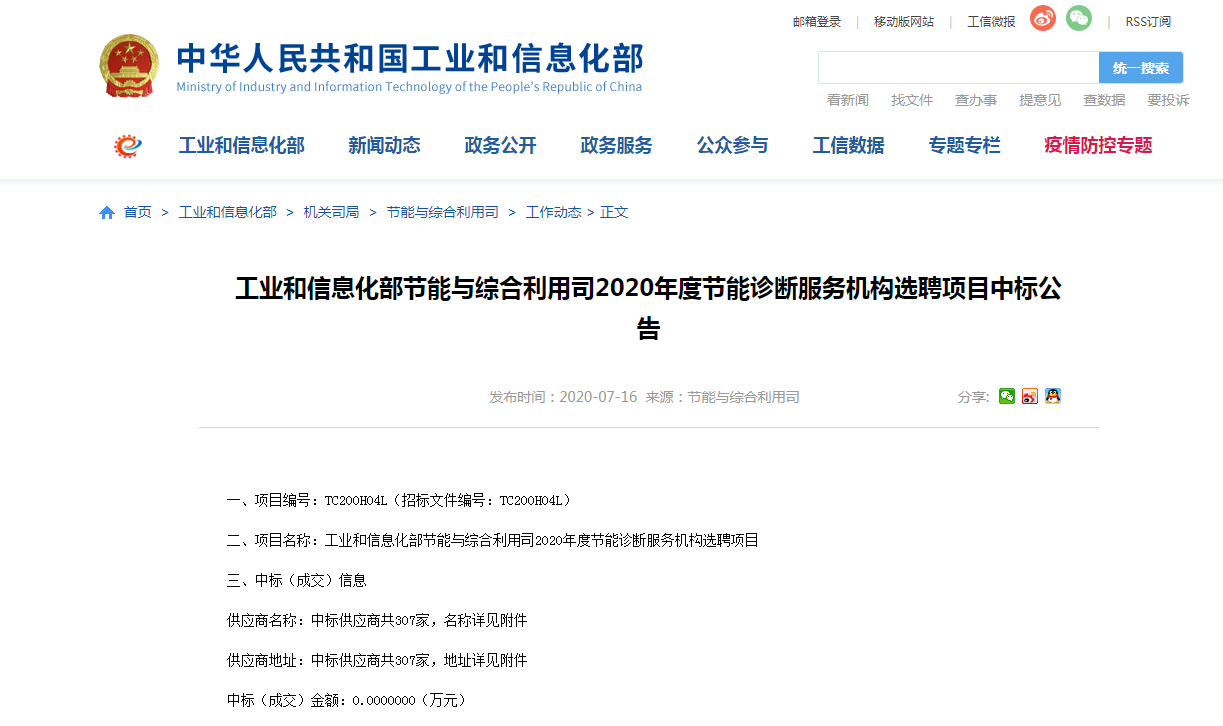 2020年7月15日,公司成功中標工業和信息化部節能與綜合利用司“2020年度國家節能診斷服務機構選聘項目合格供應商”.