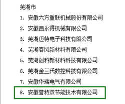 2018年8月29日,安徽省經信委通過官網發布——2018年度安徽省成長型小微企業認定名單,我公司安徽譽特雙節能技術有限公司喜獲認定,為蕪湖市僅有的八家上榜企業之一,也是蕪湖國家級經濟技術開發區和蕪湖高新技術創業園區唯一的入選企業,含金量頗高。