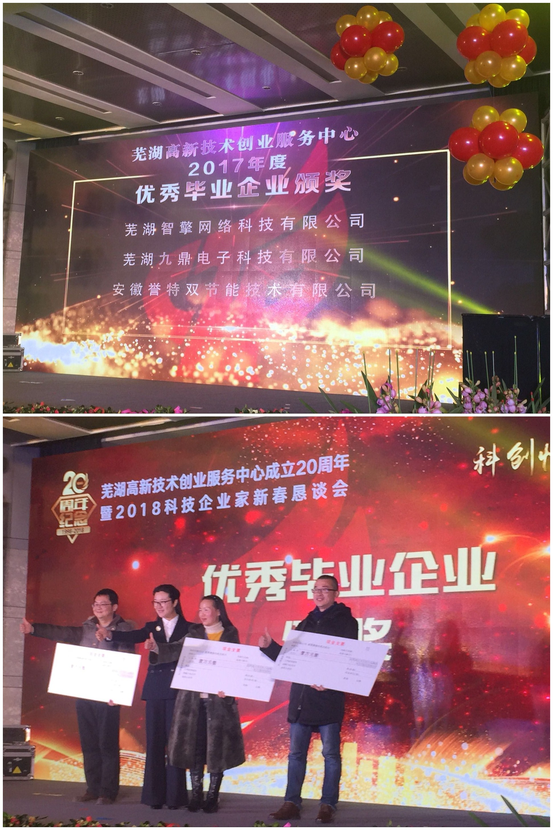 近日,我公司安徽譽特雙節(jié)能技術有限公司,榮獲蕪湖市國家級高新技術創(chuàng)業(yè)園區(qū)“2017年優(yōu)秀畢業(yè)創(chuàng)業(yè)企業(yè)”榮譽稱號。