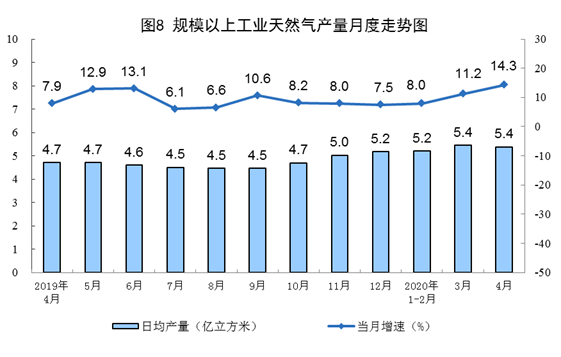 天然氣生產加快。4月份,生產天然氣161億立方米,同比增長14.3%,增速比上月加快3.1個百分點,日均產量5.4億立方米。1—4月份,生產天然氣644億立方米,同比增長10.3%。