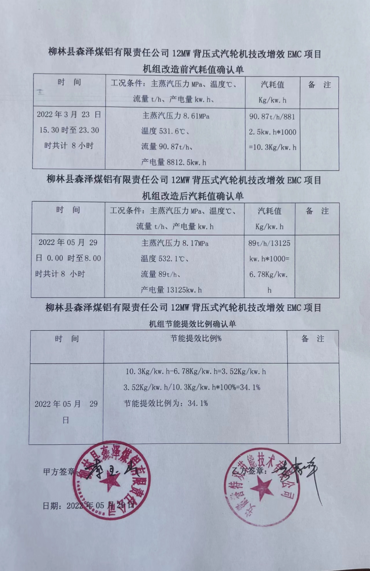山西森澤煤鋁集團12MW背壓1#機組節能技改提效合同能源管理項目順利通過工程驗收節能提效比例達34.1%遠超合同約定。