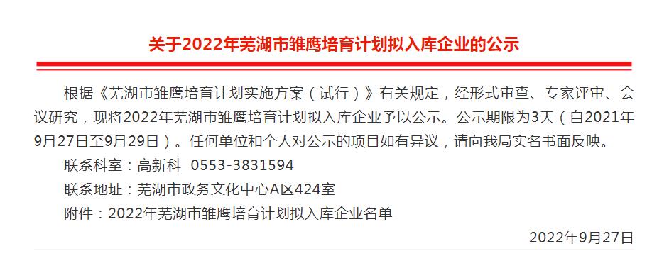 近日,經市科技局統一組織申報、形式審查、專家評審、會議研究通過,公布2022年度蕪湖市雛鷹培育計劃入庫名單,我公司喜獲認定。