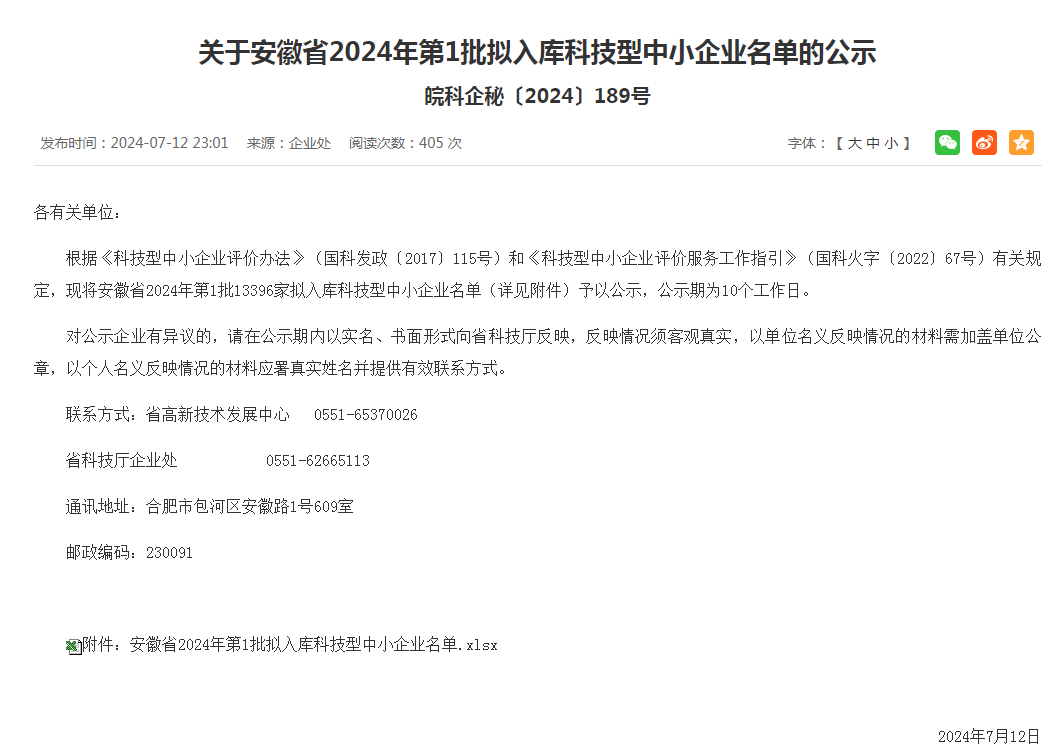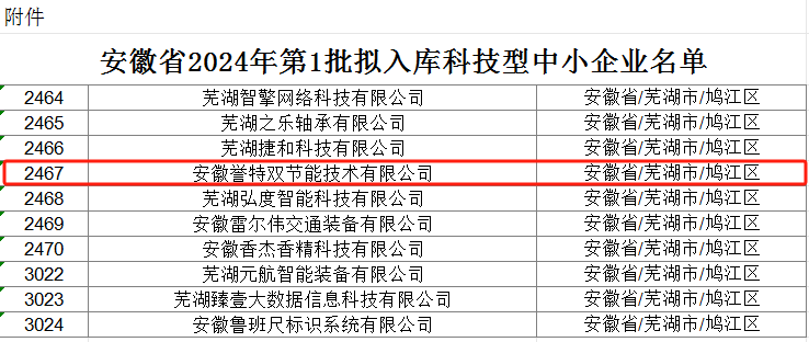 近日,根據《工業和信息化部辦公廳關于開展2024年度科技型中小企業評價工作的通知》(工信廳企業函﹝2024﹞244號)要求,通過企業評價、政府科技部門逐層審核,安徽省科學技術廳最終發布2024年第1批入庫科技型中小企業名單,我公司榮列榜單,在此表示祝賀。