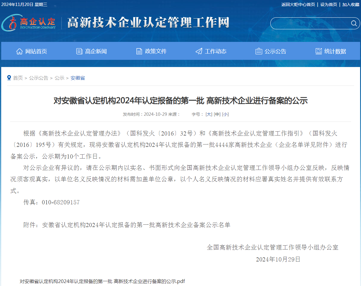 近期,全國高新技術企業認定管理工作領導小組辦公室公布了安徽省2024年認定報備的第一批高新技術企業,我公司名列其中,在此表示祝賀!同時這也是公司連續第三次被認定為國家高新技術企業。
