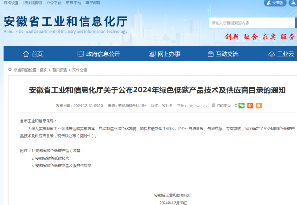 2024年12月31日,為深入實施工業領域碳達峰實施方案,推動制造業綠色化發展,加快推進新型工業化,經企業自愿申報、各地推薦、專家審核,最終由安徽省工業和信息化廳公布2024年綠色低碳產品技術及供應商目錄,我公司三個項目入選榜單,在此表示熱烈祝賀!