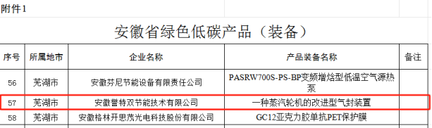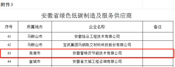 公司分別入選“安徽省綠色低碳產品(裝備)”、“安徽省綠色低碳技術”、“安徽省綠色低碳制造及服務供應商”目錄。其中安徽省綠色低碳制造及服務供應商目錄中,安徽省全行業領域共計58家企業,我公司為蕪湖市唯一一家入選企業,同時也是公司連續7年入選該目錄,再次表示熱烈祝賀!