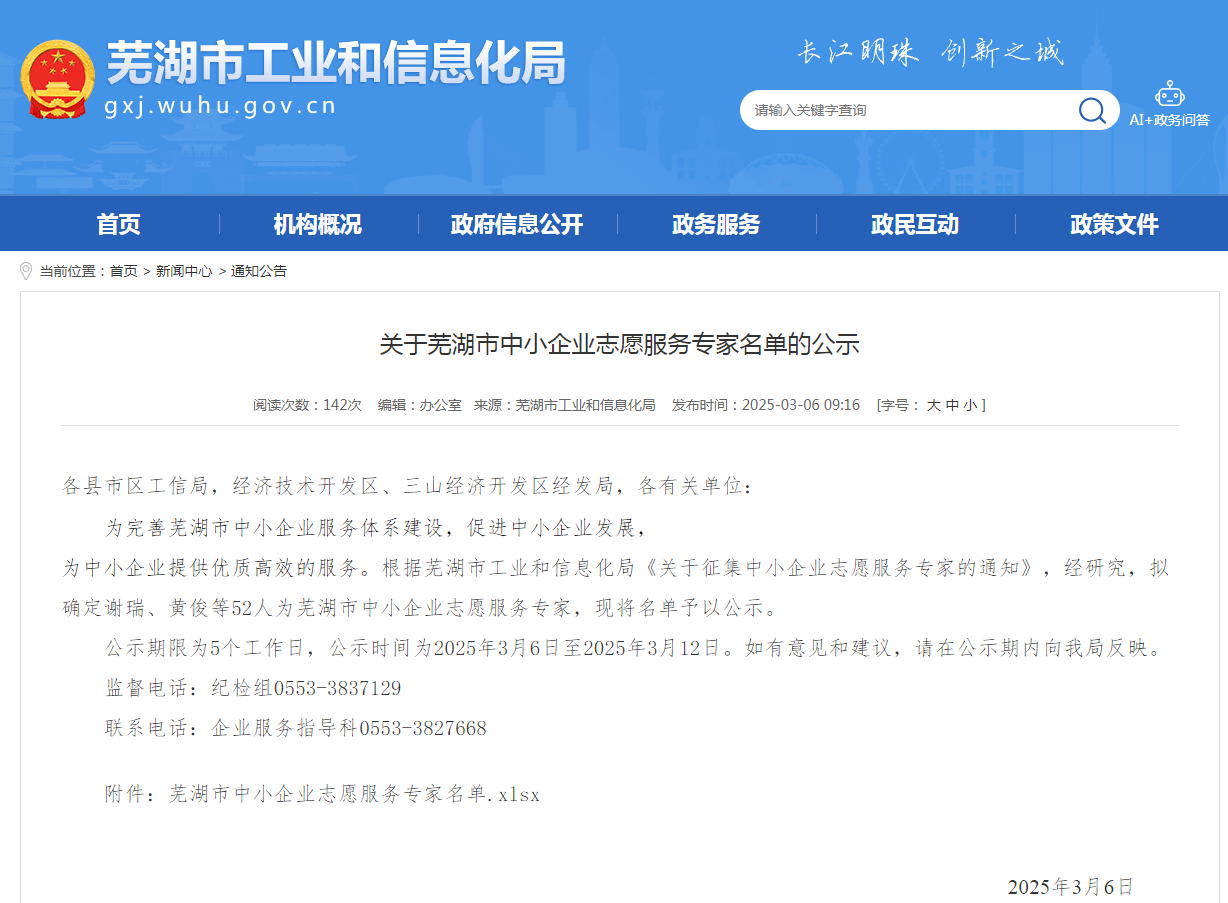 2025年3月6日,為完善蕪湖市中小企業服務體系建設,促進中小企業發展,為中小企業提供優質高效的服務,由市工信局牽頭在全市范圍內開展志愿專家征集評選工作,并最終確定52名各行業人員組成志愿專家團,我公司總經理袁克、節能事業部長湯偉兩位同志入選,在此表示熱烈祝賀。